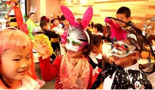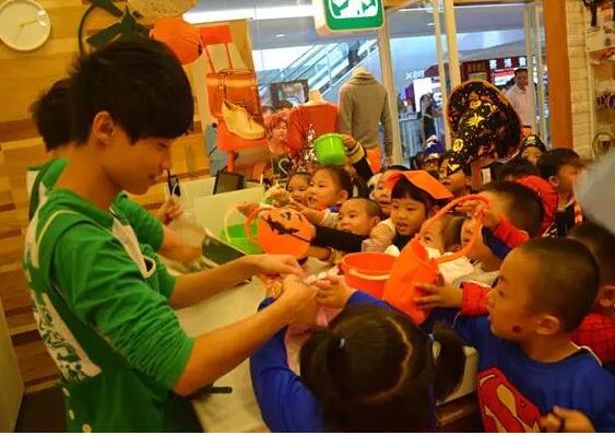 小朋友们戴上千奇百怪的面具,提上南瓜灯,前往万达广场的商户家前,威吓般地喊着:“不给糖,就捣乱”,最后比一比,看一看谁讨的糖最多~